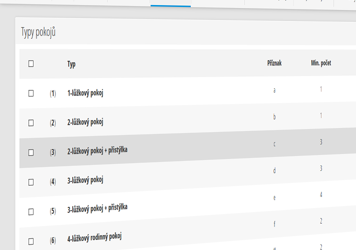 - přehled obsazených a volných pokojů